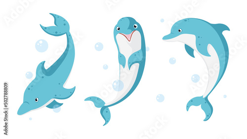 Vector illustration of cute and beautiful dolphins on white background. Charming characters in different poses with top view, side view and interest and bubbles around in cartoon style.