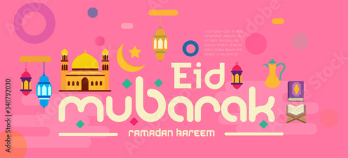 Vector illustration of eid mubarak with concept of arabic religion, islamic design crescent moon Quran surah. Ramadan holiday.