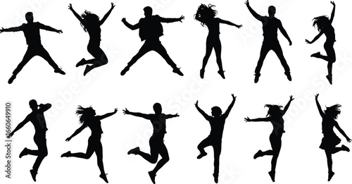jumping, dancing, silhouette, people, vector, energetic, motion, youth, freedom, happy, joy, celebration, movement, pose, energy