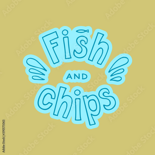 Vector illustration of fish and chips lettering for banner, leaflet, poster, clothes, logo, advertisement design. Handwritten text for template, signage, billboard, print, menu, flyer, cafe decoration