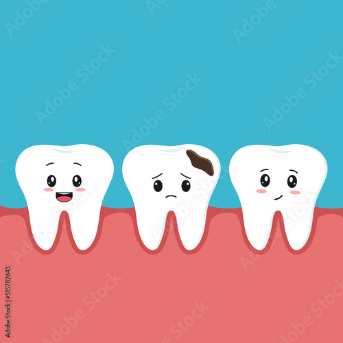 Vector illustration of healthy character teeth with smiles and a sad tooth with decay and a hole in the gums. Children's dentistry concept.