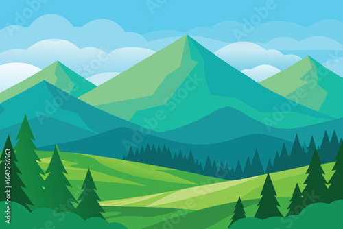 Vector illustration of lush green mountains surrounded by a dense forest under a clear blue sky.