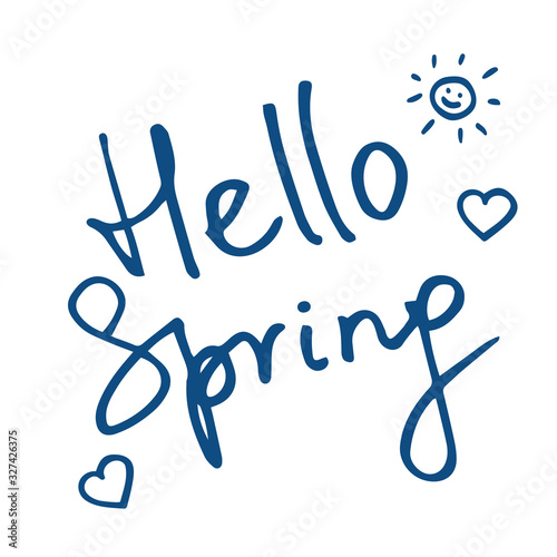 Vector illustration with inscription Hello Spring in hand lettering style with hearts. Classic blue colour