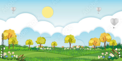 Vector illustration.Paper cut style of field landscape in summer time, Paper art spring landscape with blue sky and hot air balloons heart flying, panorama flat cartoon for Eco environmental backgroud