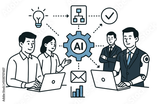 ai, human, collaboration, workflow, business, technology, artificial intelligence, teamwork, process, automation, innovation, future, integration, cyborg, robot, team, office, meeting, laptop, computer, datum, analysis, management, strategy, development, planning, idea, solution, productivity, efficiency, corporate, communication, checkmark, flowchart, graph, light bulb, gear, symbol, icon, vector, illustration, line art, minimal, concept, digital, network, partnership, assistant