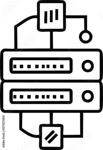 Vector Line Drawing of Computer Servers and Network Components in Minimalist Black and White Style