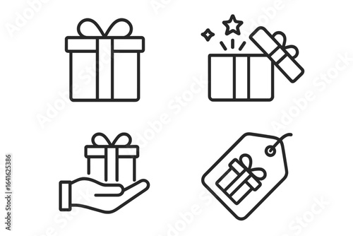 gift, present, icon, box, vector, line, set, surprise, celebration, birthday, holiday, shopping, sale, reward, tags, price, offer, open, giving, hand, christmas, anniversary, loyalty, bonus, special, outline, symbol, illustration, design, simple, minimal, linear, editable, stroke, graphic, pictogram, signs, pack, collection, purchase, coupon, black, white, isolated
