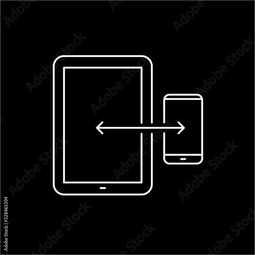 Vector linear icon with syncing tablet and smart phone | flat design thin line white modern illustration and infographic isolated on black background