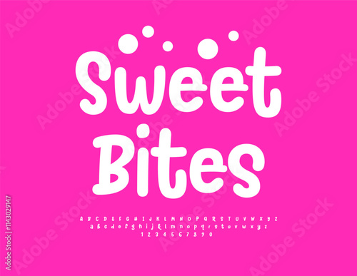 Vector modern card Sweet Bites. Playful White Font. Funny Children Alphabet Letters and Numbers set