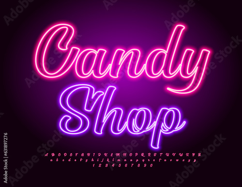 Vector Neon Signboard Candy Shop. Electric handwritten Font. Glowing Alphabet Letters and Numbers