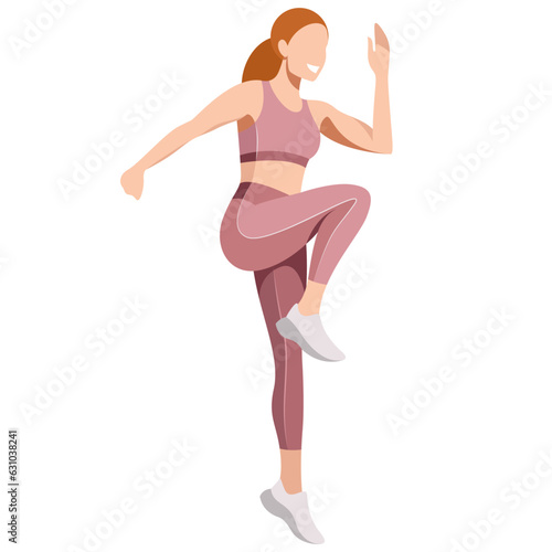 vector realistic image of a slim girl in a sports uniform (leggings and a sports bra) is engaged in fitness, sports, training, isolated on a white background. the girl is engaged in aerobics, jumping.