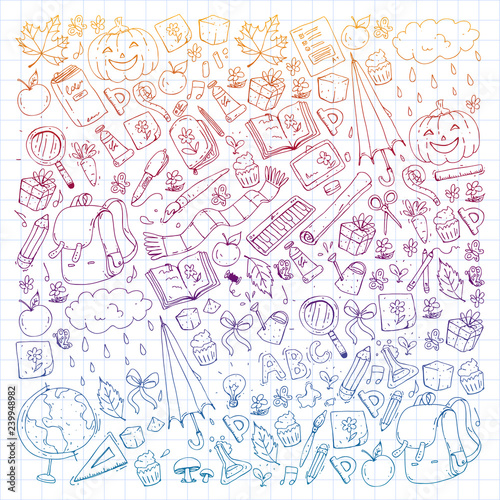 school, element, education, lesson, class, book, pattern, icon, backpack, foulard, autumn, halloween, pumpkin, umbrella, alphabet, rudiments, literature, rain, cloud, weather, background, apple, globe, earth, college, student, drawing, painting, reading, learn, paint, read, mathematic, biology, draw, flower, butterfly, music, cupcake, nature, chalk, lens, magnifying glass, vector, pencil box, pen, crayons, geometry