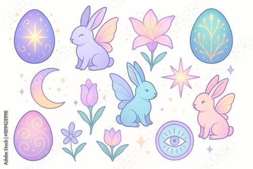 Vector set of enchanted eggs fairy bunnies glowing flowers and mystical symbols pastel fantasy style white background