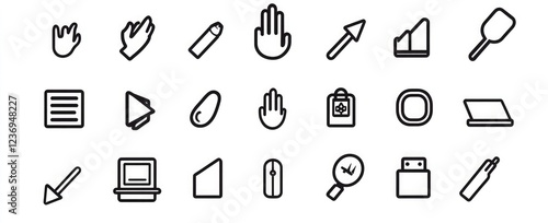 Vector set of hand, mouse, and finger icons with up and down arrows, as well as computer and web icons, isolated on a white background