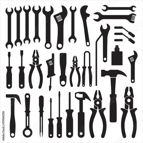 tool, hammer, tool, vector, screwdriver, saw, wrench, set, icon, plier, work, equipment, construction, collection, spanner, illustration, silhouette, metal, carpenter's shop, hand, scissors, symbol, wood, icon, drill