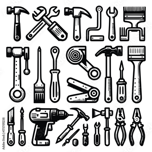 tool, hand tool, wrench, hammer, screwdriver, drill, plier, saw, brush, equipment, repair, construction, mechanic, carpenter's shop, bricolage, workshop, maintenance, engineering, vector, outline, black-and-white, bold, icon, hardware, vintage, industrial, illustration, engraving, graphic design, service, symbol