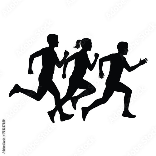 vector, illustration, scalable, icon, silhouette, running, runner, athlete, sport, sport, fitness, health, exercise, jogging, activity, movement, motion, group, team, competition, race, marathon, track, field, outdoors, athletic, active, lifestyle, person, people, man, woman, male, female, dynamic, energy, speed, graphic, design, element, clip art, file, art, digital, modern