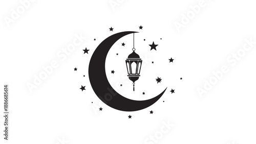 vector silhouette Magical crescent moon with hanging lantern and stars