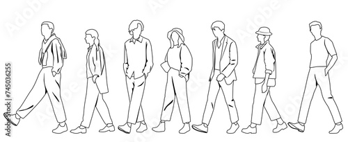 Vector silhouettes of men and women, group of walking business people, teenagers, profile, linear sketch, black color isolated on white background