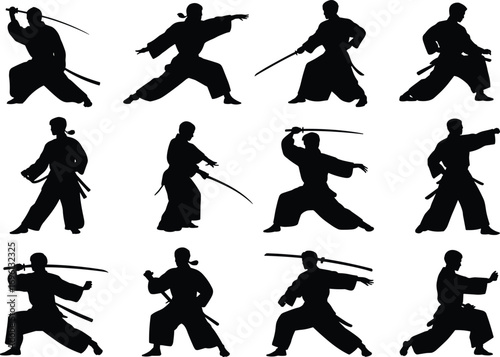 Vector Silhouettes of Samurai Martial Artists with Katana in Action Poses – Japanese Sword Fighting and Traditional Warrior Training Concepts