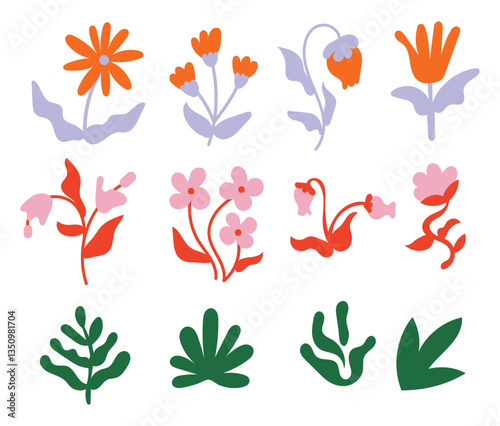 Vector simple illustrations, simple wavy and groovy, hand drawn naive style, flowers and plants