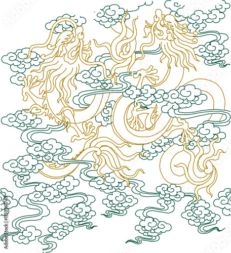 Vector sketch illustration silhouette design painting classic vintage ethnic traditional dragon flying on cloud