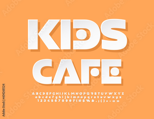 Vector stylish Sign Kids Cafe. Trendy White sticker Font. Creative Alphabet Letters, Numbers and Symbols set
