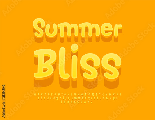Vector Sunny flyer Summer Bliss. Joyful Yellow 3D Font. Funny Alphabet Letters and Numbers set.