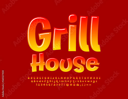 Vector trendy sign Grill House. Bright Funny Font. Glossy handwritten Artistic Alphabet Letters and Numbers set