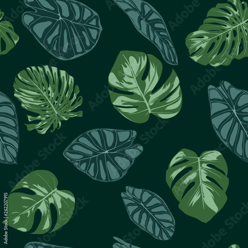 Vector Tropic Seamless Pattern. Philodendron and Alocasia Leaves. Hand Drawn Jungle Foliage in Watercolor Style. Exotic Background. Seamless Tropic Leaf for Textile, Cloth, Fabric, Decoration, Paper.