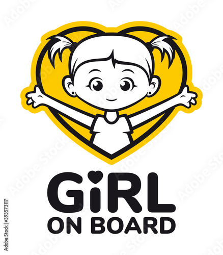 Vector yellow symbol heart with the inscription: Girl on board. Picture of a little girl with ponytails. Isolated on white background.