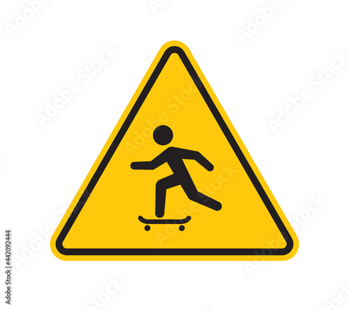 Vector yellow triangle sign - black silhouette symbol skateboarder. Isolated on white background.