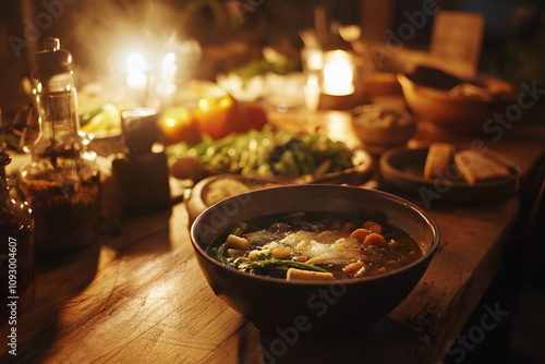 Vegan Comfort Food for Winter. A cozy scene with warm vegan comfort foods, such as a bowl of vegetable soup, perfect for wintertime