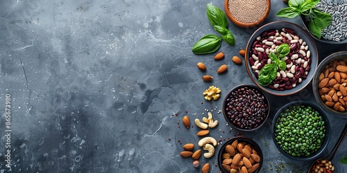 Vegan food with nuts, beans, greens and seeds. A gray background with copy space