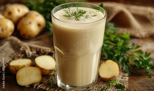 Vegan potato milk in a glass with potatoes on a brown kitchen background, plant milk