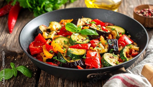 vegan, vegetable, mediterranean, courgette, aubergine, paprika, herb, vegetal, rustic, kitchen, dinner, dinner, healthy, organic, fresh, vegetarian, food, cooking, olive oil, enjoyment, lifestyle, simply, fast, warm, pan, traditional, natural, balanced, slight