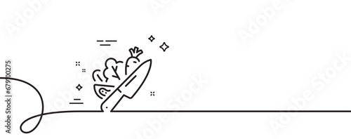 Vegetable line icon. Continuous one line with curl. Cut lettuce sign. Spinach leaf, tomato and carrot symbol. Vegetable single outline ribbon. Loop curve pattern. Vector