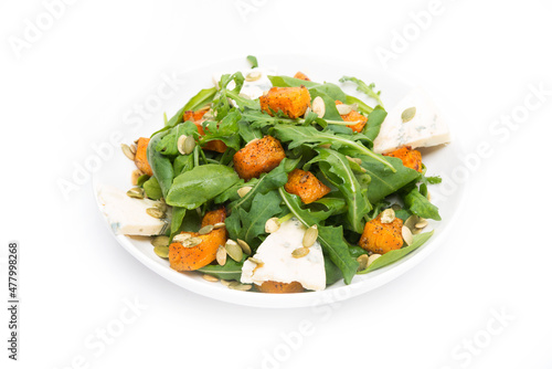 Vegetable salad with pumpkin, arugula and blue cheese on a white background