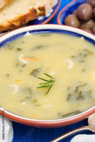 vegetable soup in bowl and olives with corn bread