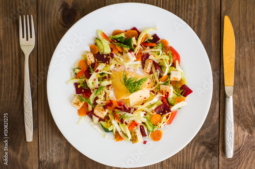 Vegetarian salad with vegetables and cheese crisps. Wooden table. Top view. Close-up