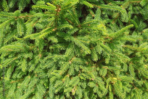 Vegetative background. Green branches of fir tree on sunny day