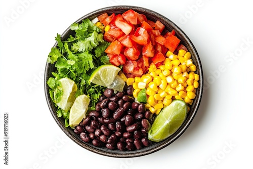 Veggie burrito bowl with black beans and corn isolated on a white, top view