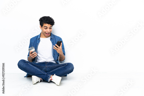 Venezuelan man sitting on the floor holding coffee to take away and a mobile