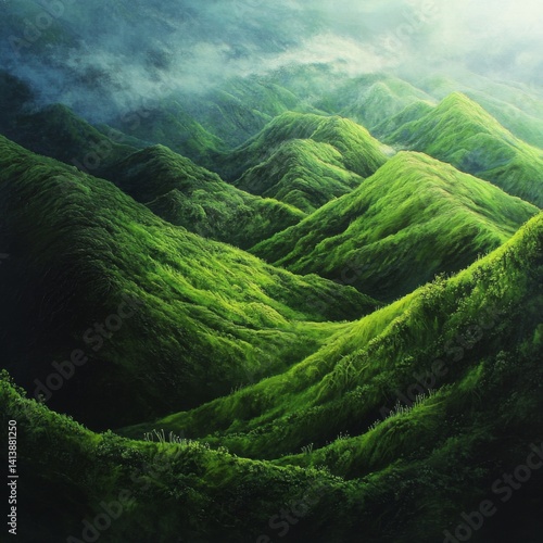 Verdant rolling hill covered with lush green grass blades forming soft undulating shapes and majestic silhouettes.