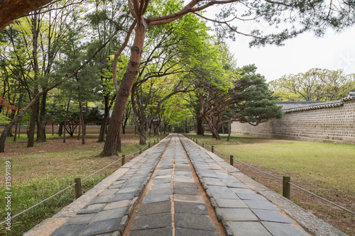 shrine, seoul, south, korea, east, asia, horizontal, outdoors, daylight, nobody, travel, destination, holiday maker, attraction, tree, verdant, lush, foliage, footpath, path, pathway, nature, natural, leaf, green, park, famous, unesco, world heritage, lawn, front, stone, wall