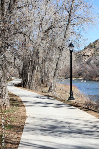 paved, concrete, trail, paseo, curving, bare trees, durango, colorado, pathway, nobody, empty, light, street light, hiking trail, tour tourism, travel destination