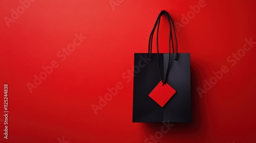 Vertical layout of a shopping bag with a sale tag symbolizing Black Friday discounts on a bright red backdrop