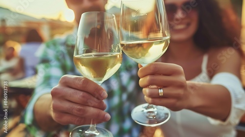 Vertical Mature smiling couple toasting white wine glasses to the camera Middle aged married people drinking alcohol on a bar terrace Two adult partners clinking with alcohol beverages : Generative AI