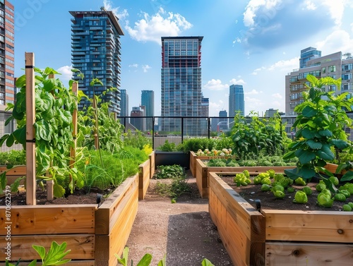 vertical organic vegetable garden with rustic wooden raised beds lush green plants climb trellises showcasing sustainable urban farming amidst a bustling cityscape backdrop