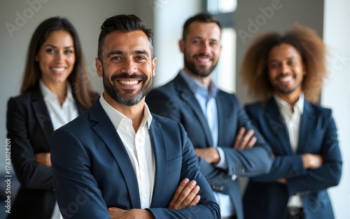 Vertical portrait of smiling mature Latin hispanic business man and European business woman standing arms crossed in office. Diverse colleagues, group team of confident professional business people.
